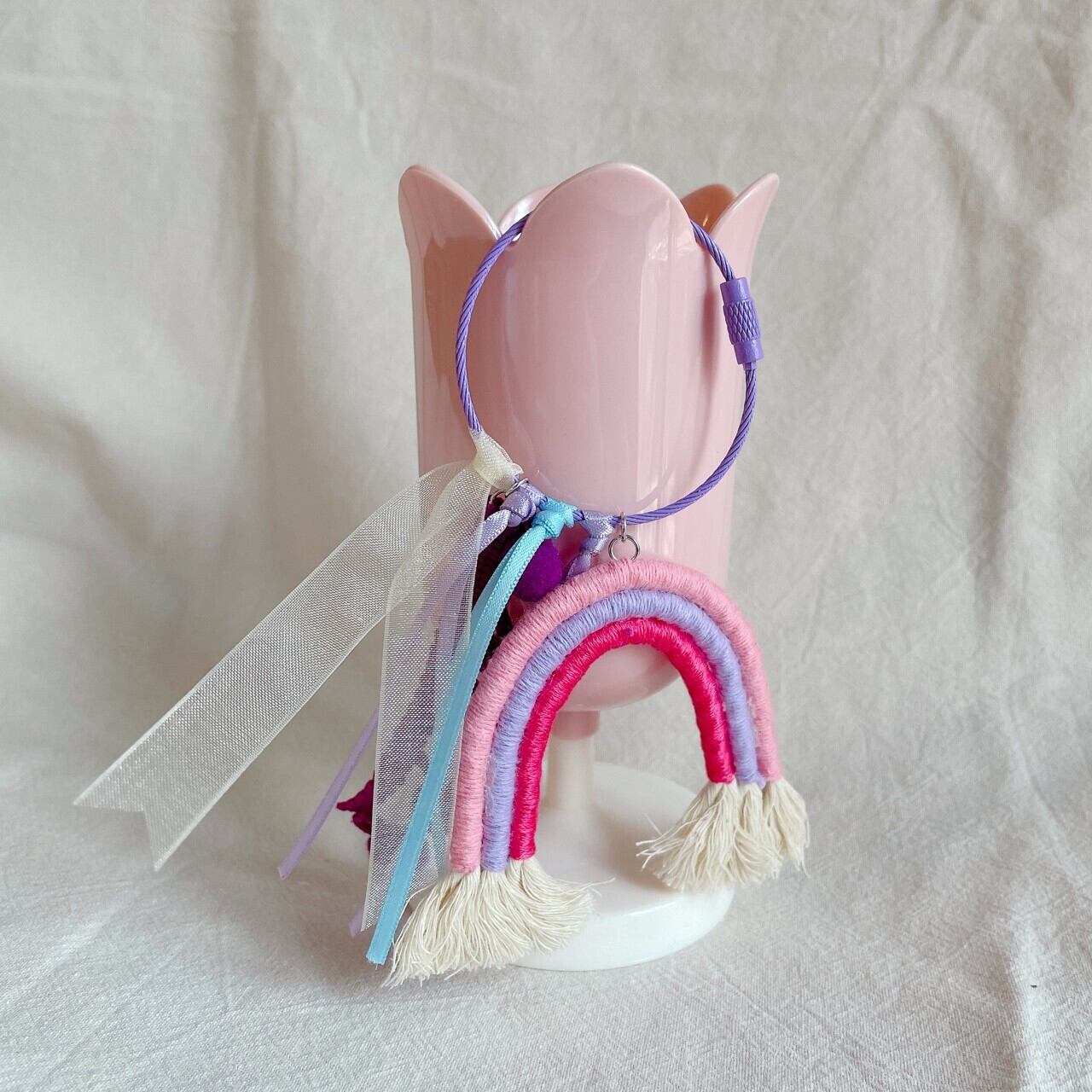 ロープに刺繍糸を巻き付けて作ったレインボーを、リボンやポンポンブレードと一緒に♡