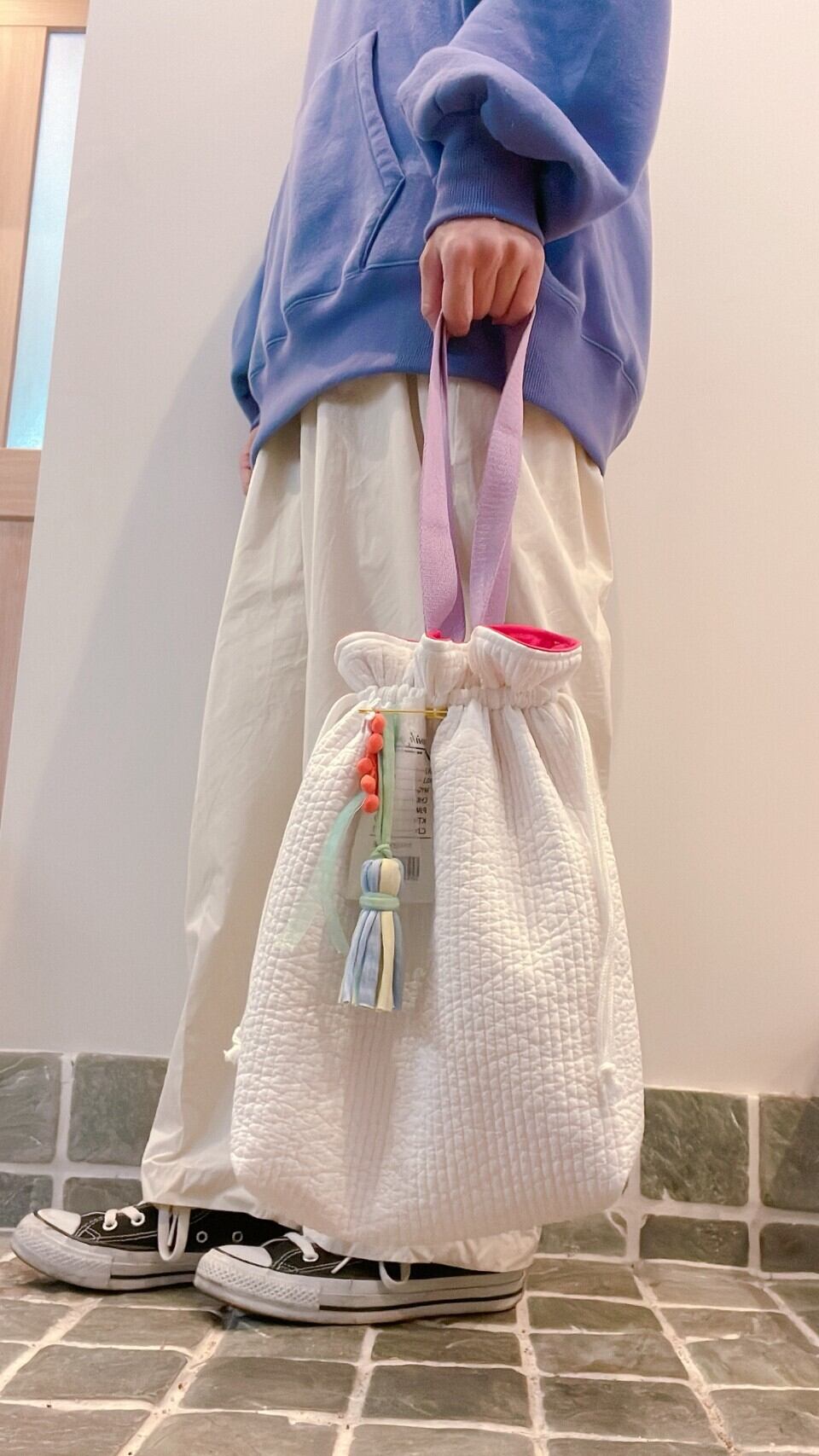 キュッと絞っても、もちろんそのままでも使用してもかわいいバッグです♡