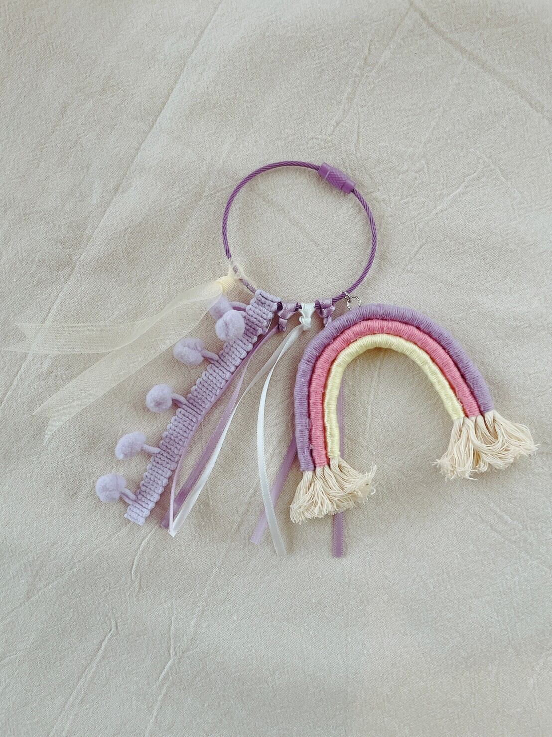 ロープに刺繍糸を巻き付けて作ったレインボーを、リボンやポンポンブレードと一緒に♡