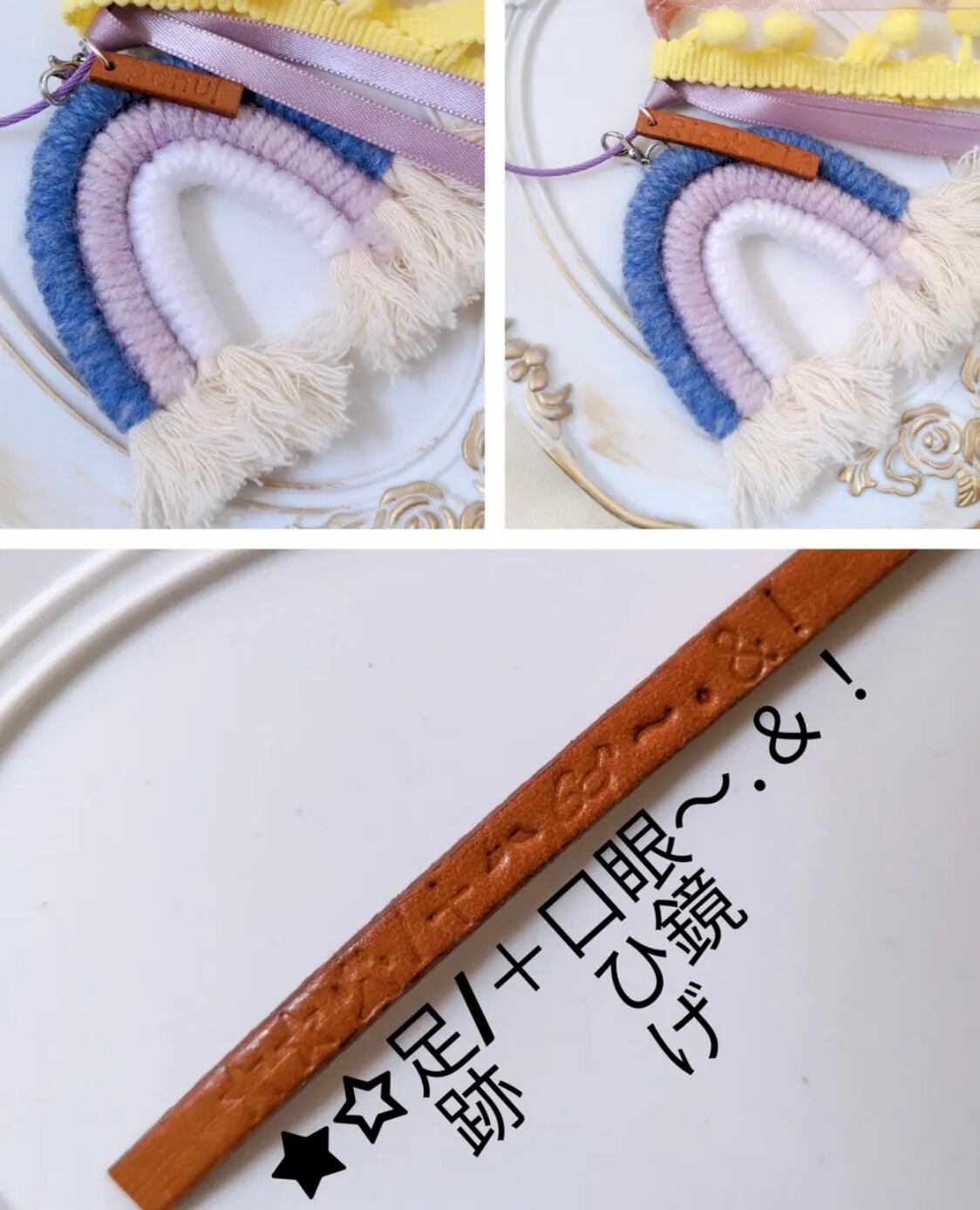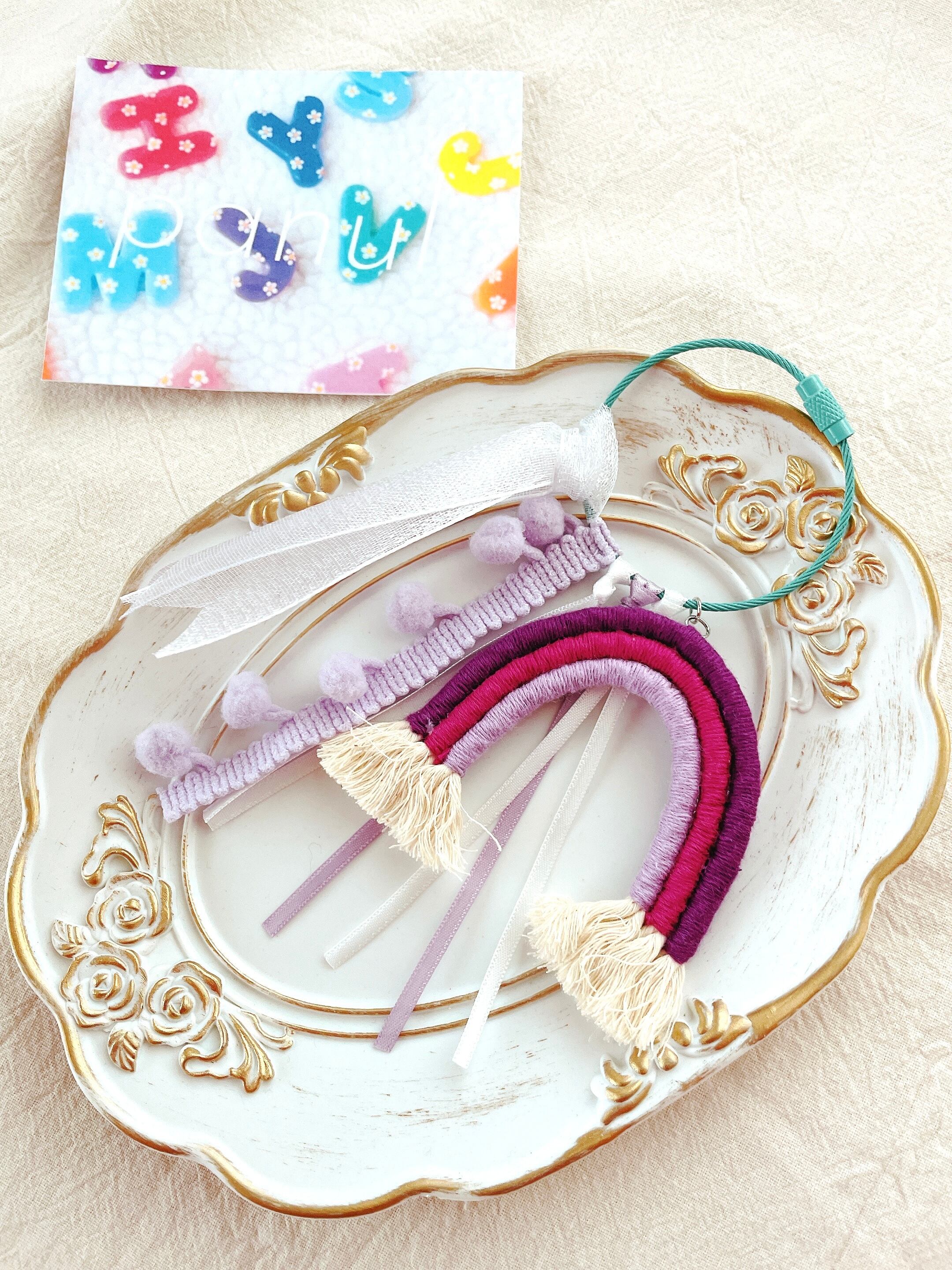 ロープに刺繍糸を巻き付けて作ったレインボーを、リボンやポンポンブレードと一緒に♡